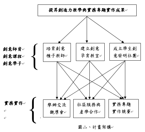 本計畫包含:通識教育與專業教育之整合,創造力教學部份包括創意教師培訓、創意課程開發、與創意學子孕育;創造力成果永續經營包括舉辦交流觀摩會、社區服務與產學合作、與實務專題實作競賽。