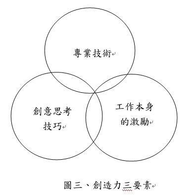 創造力的三要素(如圖三)包括專業技術、創意思考的技巧、與工作本身的激勵。實務專題實作旨在激發學生創意思維與行動力,鼓勵學生展現多元智能、發揮團隊合作及平等參與的精神,實際體驗創造歷程,並提供與跨領域同儕觀摩交流的機會。