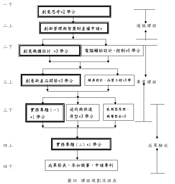 本課程是以本校工程領域大學部學生為規劃對象,由一年級新生的通識課程起至四年級實務專題止,共提供10門課程28個學分,課程名稱、學分數與開課年級如圖四所示。課程中提昇創意能力方面的課程有6門課程13個學分(圖中粗框內課程),為學生必須修畢的課程,同時因學生需具有踏實的工程專業知識才能有良好的「創造力與創意設計」成果,本學程亦規劃5門課程15個學分的專業課目(圖中細框內課程)供學生選修,圖中細框顯示之課程為參考名稱,實際專業課程可依該創意專題之專業知識要求而定。
