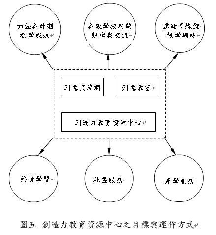 創造力中心並以公開方式接受臨近社區或產業委託,透過創意工作室與學生創意社團,從事產學合作、社區服務。創造力教育資源中心之目標與運作方式如圖五所示。
